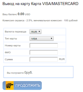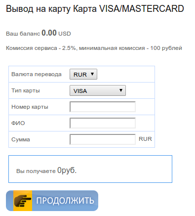 Заполняем 16значный номер карты, ФИО владельца карты (на русском) и сумма вывода (значение без копеек), выбираем тип валюты RUR или USD. тип вашей карты и жмем продолжить